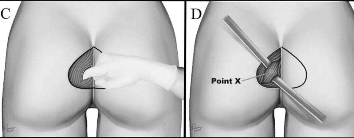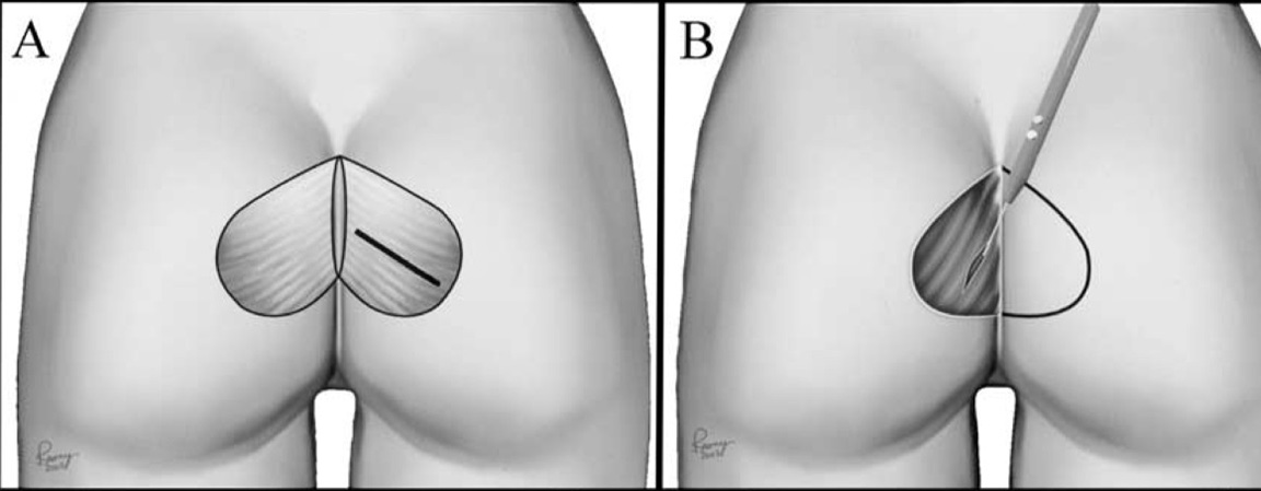 Η επέμβαση γίνεται με γενική αναισθησία ή επισκληρίδειο και η τομή είναι περίπου 5-6 εκατοστά και γίνεται στην σχισμή εντός των γλουτών (κόκκυγας).