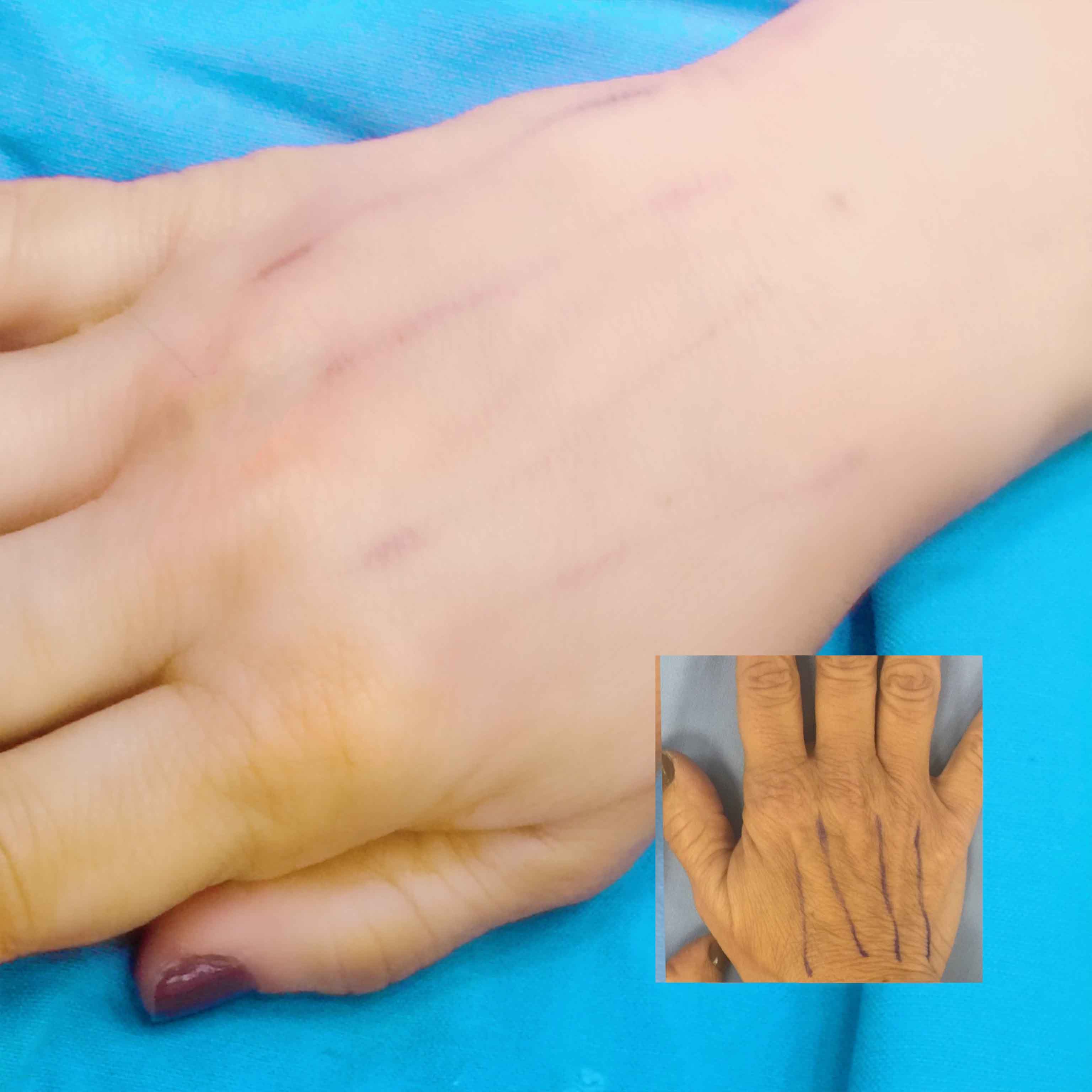 Ενέσεις λίπους : το γέμισμα της ραχιαίας επιφάνειας της άκρας χειρός μπορεί να πραγματοποιηθεί κυρίως με ενέσεις λίπους.