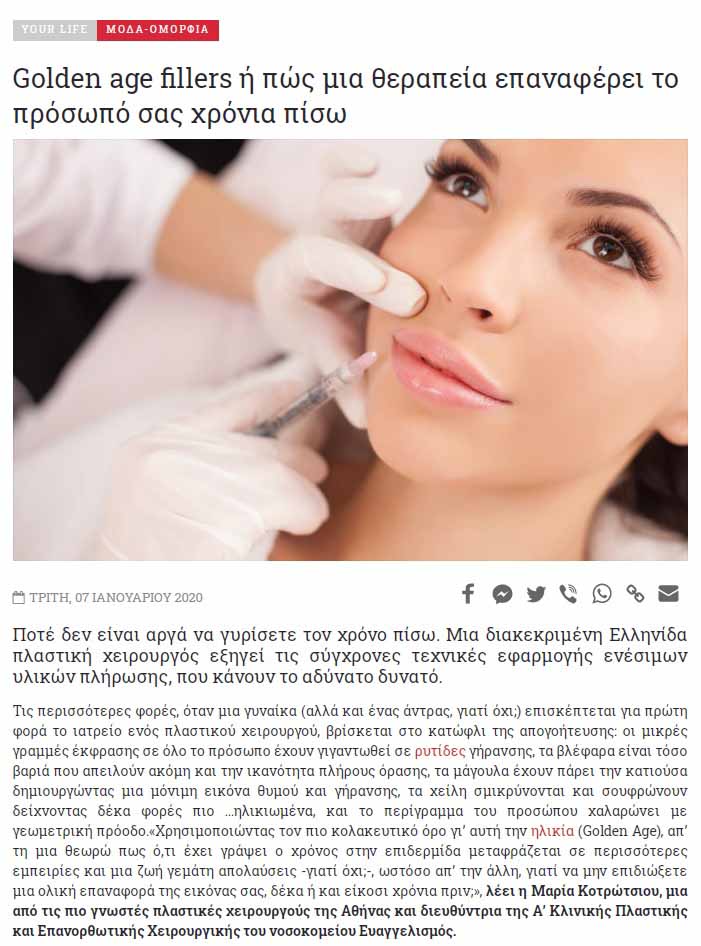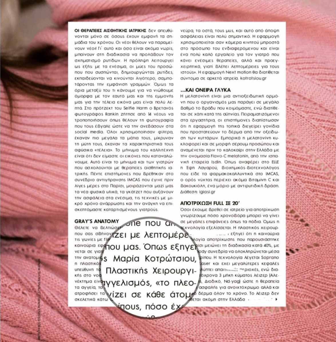 Περιοδικό ELLE H Γιατρός dr Μαρία Κοτρώτσιου MD,Ph,D περιγράφει τις ενέσιμες Θεραπείες για το πρόσωπο, τις τελευταίες εξελίξεις και τεχνολογία στο περιοδικό Elle Μαρτίου 2019.