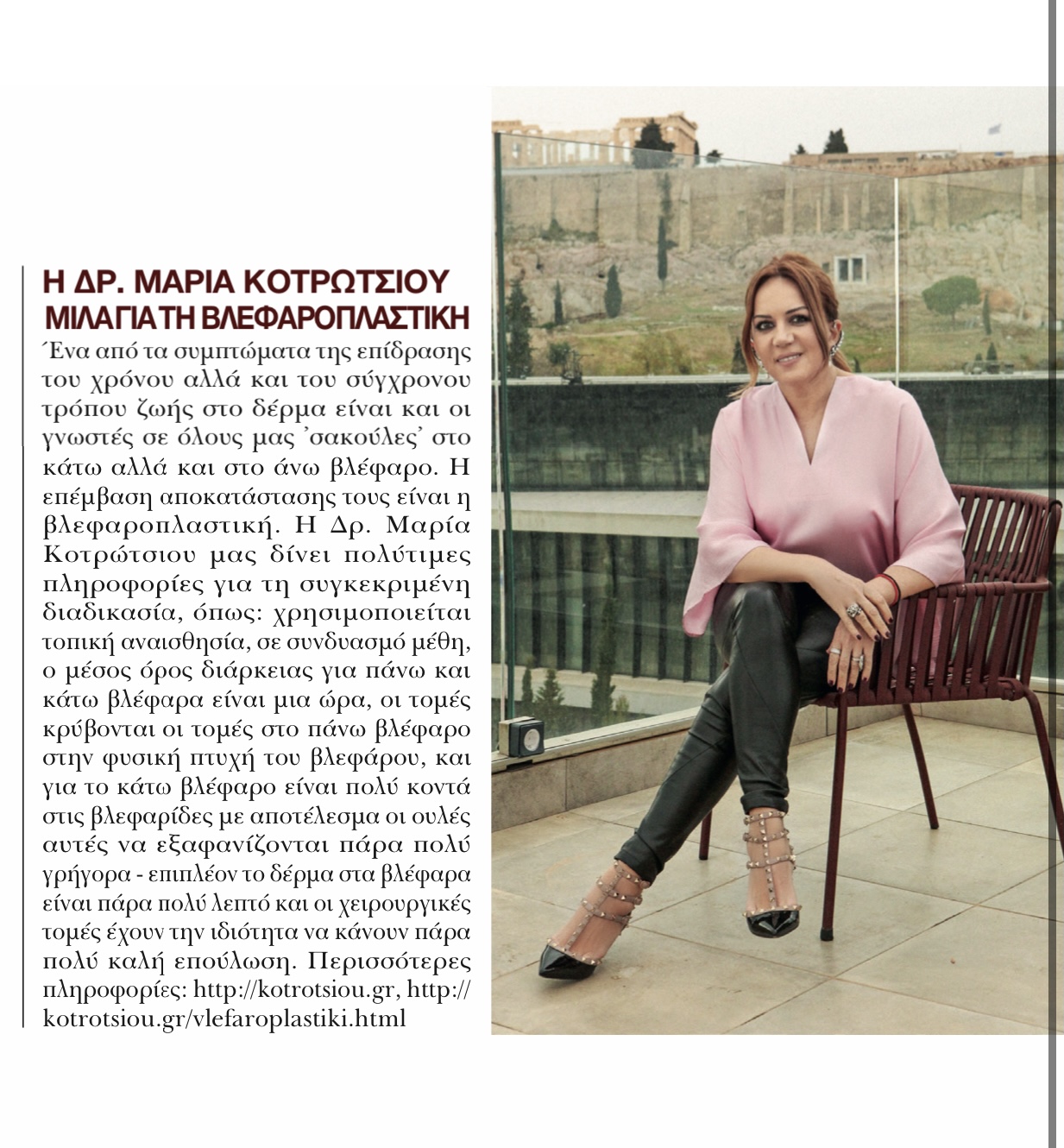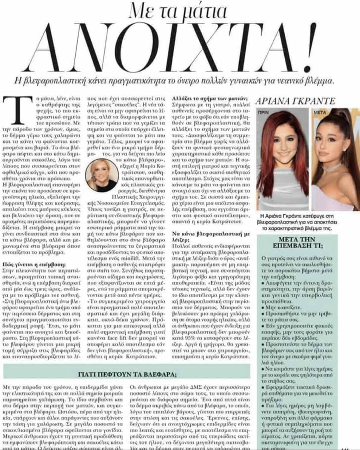 Περιοδικό ELLE Βλεφαροπλαστικη στο περιοδικό Elle. H Γιατρός dr Μαρία Κοτρώτσιου MD,Ph,D περιγράφει την βλεφαροπλαστική για την αποκατάσταση των άνω και κάτω βλεφάρων μετά από χαλάρωση.