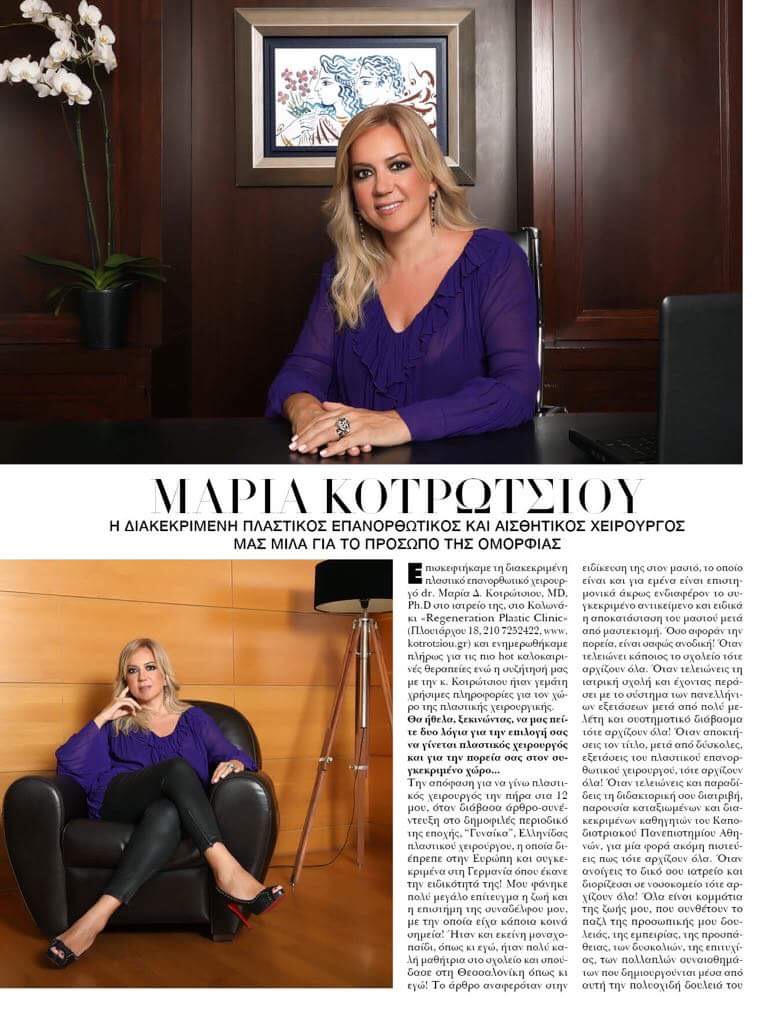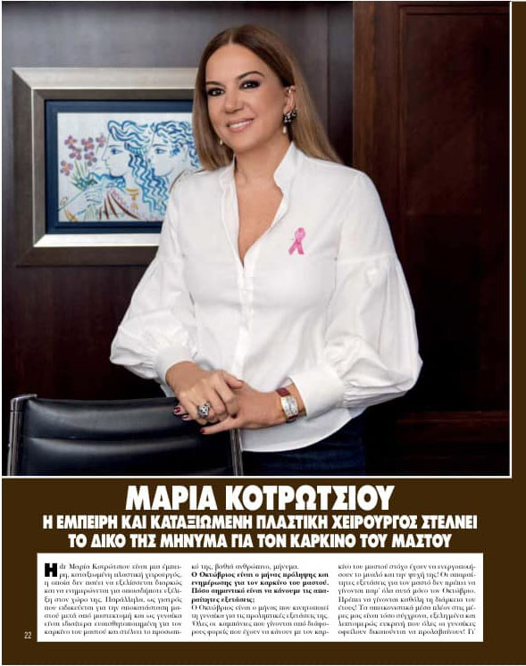 Περιοδικό ELLE Αποκατάσταση Μαστού μετά από μαστεκτομή. Παγκόσμια Μέρα για τον καρκίνο του μαστού. Τιμητικό αφιέρωμα στην πλαστικό χειρουργό dr Μαρία Κοτρώτσιου MD,Ph,D από το περιοδικό Elle για την προσφορά της.