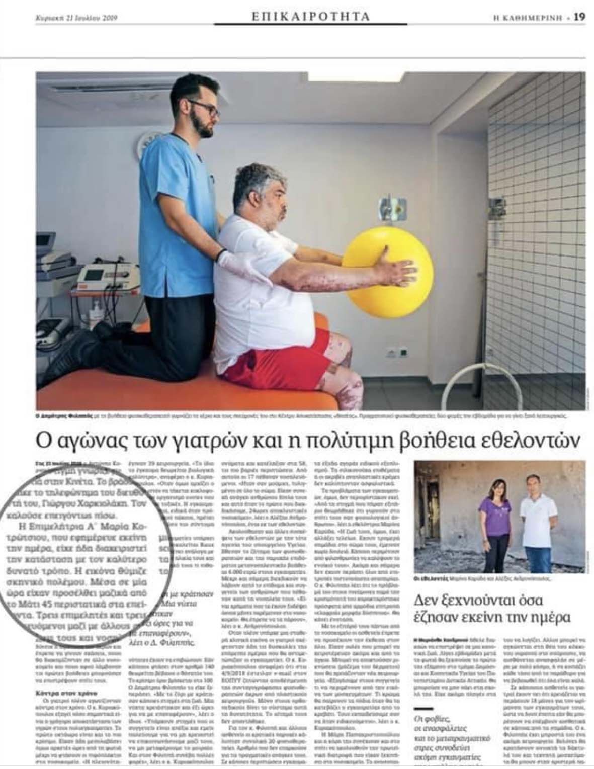 Εφημερίδα Καθημερινή της Κυριακής Αφιέρωμα της εφημερίδας Η Καθημερινή της Κυριακής στον αγώνα των γιατρών της πλαστικής επανορθωτικής χειρουργικής του νοσοκομείου ΕΥΑΓΓΕΛΙΣΜΟΣ ένα χρόνο μετά τη φωτιά στο Μάτι.