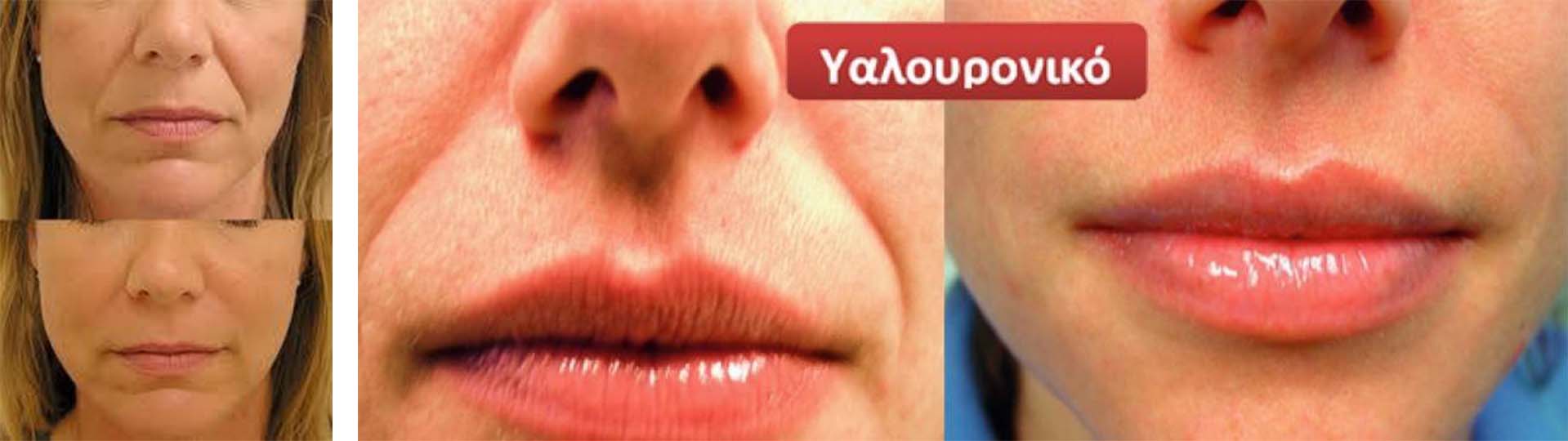Με την εφαρμογή λεπτών ενέσεων Υαλουρονικού οξέος στις ρυτίδες της γωνίας του στόματος, στις ρινοπαρειακές πτυχές στις ρυτίδες του μετώπου και του μεσόφρυου, επιτυγχάνουμε να προσδώσουμε ελαστικότητα και σφριγηλότητα, όγκο και υγρασία στο δέρμα.